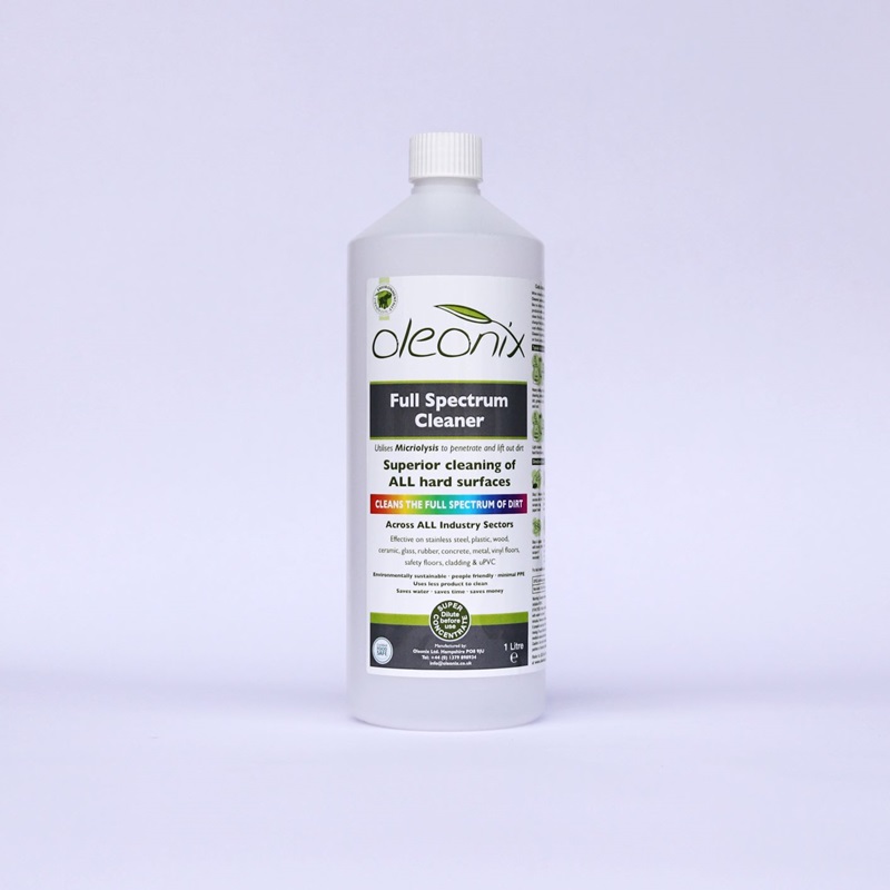 The primary product in the Oleonix range for superior cleaning of all hard surfaces. When mixed with water Oleonix Full Spectrum Cleaner penetrates and lifts out dirt and soiling like no other cleaner and can be safely used on stainless steel, plastic, wood, ceramic, concrete, glass, rubber, metal, vinyl floors, safety floors, cladding, uPVC, canvas etc. Full Spectrum Cleaner is so versatile it can replace numerous products to safely and effectively clean the full spectrum of applications with just this one product. Suitable for all industries, simply change the dilution for optimum efficiency and cost effectiveness. Oleonix Full Spectrum Cleaner is certified safe to use in food preparation applications and is certified not to taint.