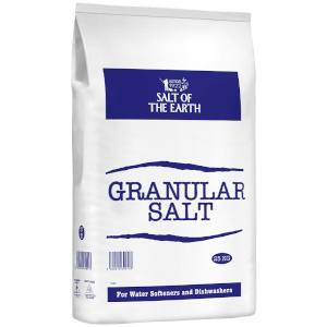 Granular salt, used for water treatment and softening in dishwashers and water softeners.