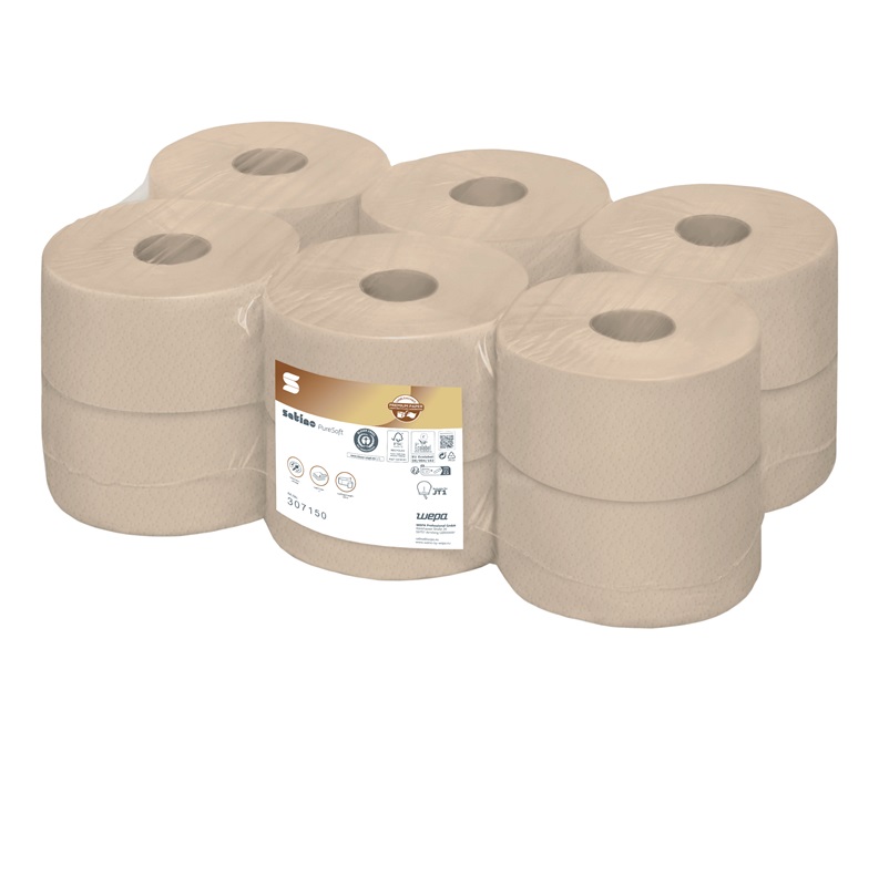 2 ply Beige centre pull toilet rolls. Different to standard re-cycled products these are made solely from re-cycled cardboard boxes, which creates a softer feel, better breakdown properties, and more “wet strength”. 120mm width, 180m length.