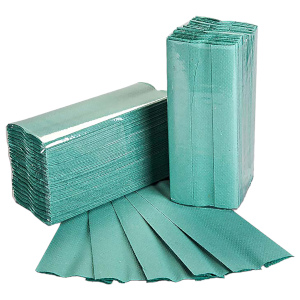 Green C-fold hand towels in a 1 ply tissue which is strong and absorbent, great for hand drying or wiping spills. Individually folded and packed in sleeves for easy refilling. Fits most hand towel dispensers.