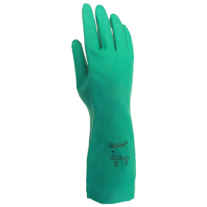 Nitrile industrial gauntlet gloves designed to offer protection against a wide range of chemicals including strong detergents, oils and certain solvents. Heavy duty nitrile achieves an excellent abrasion score. Cotton flock lining absorbs perspiration and keeps hands dry, cool and comfortable. Non-slip textured palm and fingers for enhanced grip. Rolled cuff for extra strength and prevention of liquid roll-back. Latex free for prevention of natural latex allergies. Size 9 - Large